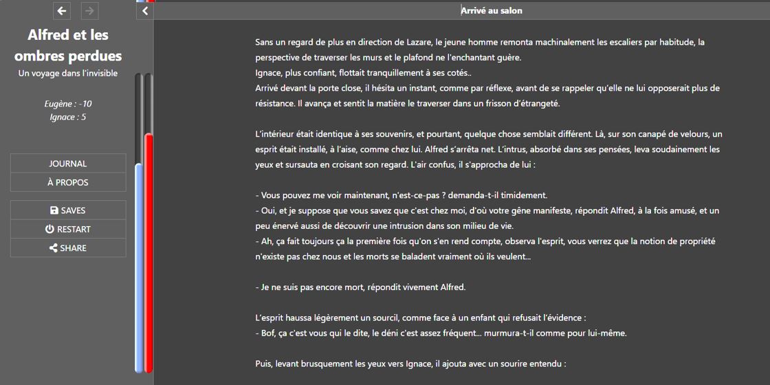 Ce projet consistait en la conception d’un scénario interactif pour un jeu vidéo narratif textuel. Ce travail a renforcé ma capacité à exprimer des idées complexes tout en structurant un récit non linéaire engageant et cohérent pour l’utilisateur. Le choix du ton et du rythme du récit ainsi que la vraisemblance des dialogues étaient des éléments de considération importants. Les différentes analyses de synopsis existants à travers certains TP m’ont conduit à porter une attention particulière à la structure d’une intrigue et de son message
